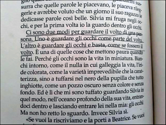 “Ieri ho incontrato una persona che non vedevo da tanto, l’ho guardata negli occhi e da lì ho capito che gli stava andando tutto bene. Questo mi ha fatto pensare a quanto io dia molta importanza agli occhi e a quello che essi possono trasmettere. E riguardo a questo stamattina mi sono ricordata di un libro letto in seconda superiore: “Bianca come il latte rossa come il sangue” e ho trovato un pezzo sugli occhi.