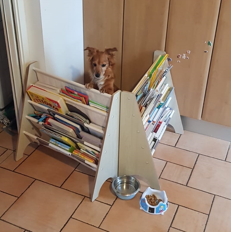 La foto qui sopra è di giovedì a pranzo: il recinto non era ancora arrivato e quindi avevo optato per una soluzione temporanea. Le librerie di Mariasole avrebbero dovuto avere il compito di tenerlo al riparo da fughe per la casa (Mou è un cagnolino piuttosto dinamico), ma non gli impedivano di fare cucù suscitando le risate di Mariasole (e non facendo bene alla sua schiena). Poi finalmente il recinto, a cui si è abituato piuttosto in fretta.
