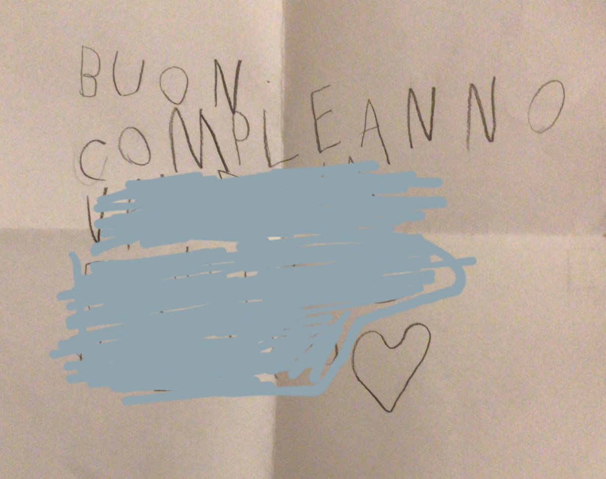 “Ho scelto di portare come gemma questo biglietto, che mi hanno scritto i miei cugini al mio compleanno. Nonostante noi abbiamo un po’ di anni di differenza, infatti loro hanno 5 e 7 anni, sono abbastanza legata a loro perché quando ero più piccola, più o meno alle medie, passavo molto tempo d’estate con loro e con gli altri miei cugini e ho un bellissimo ricordo di quel periodo. L’altro giorno ho trovato questo biglietto e mi ha fatto pensare a quanto il tempo passi veloce e a come le cose cambiano perché adesso li vedo di meno e con altri cugini ho anche perso un po’ i rapporti senza volerlo” (V. classe quarta).