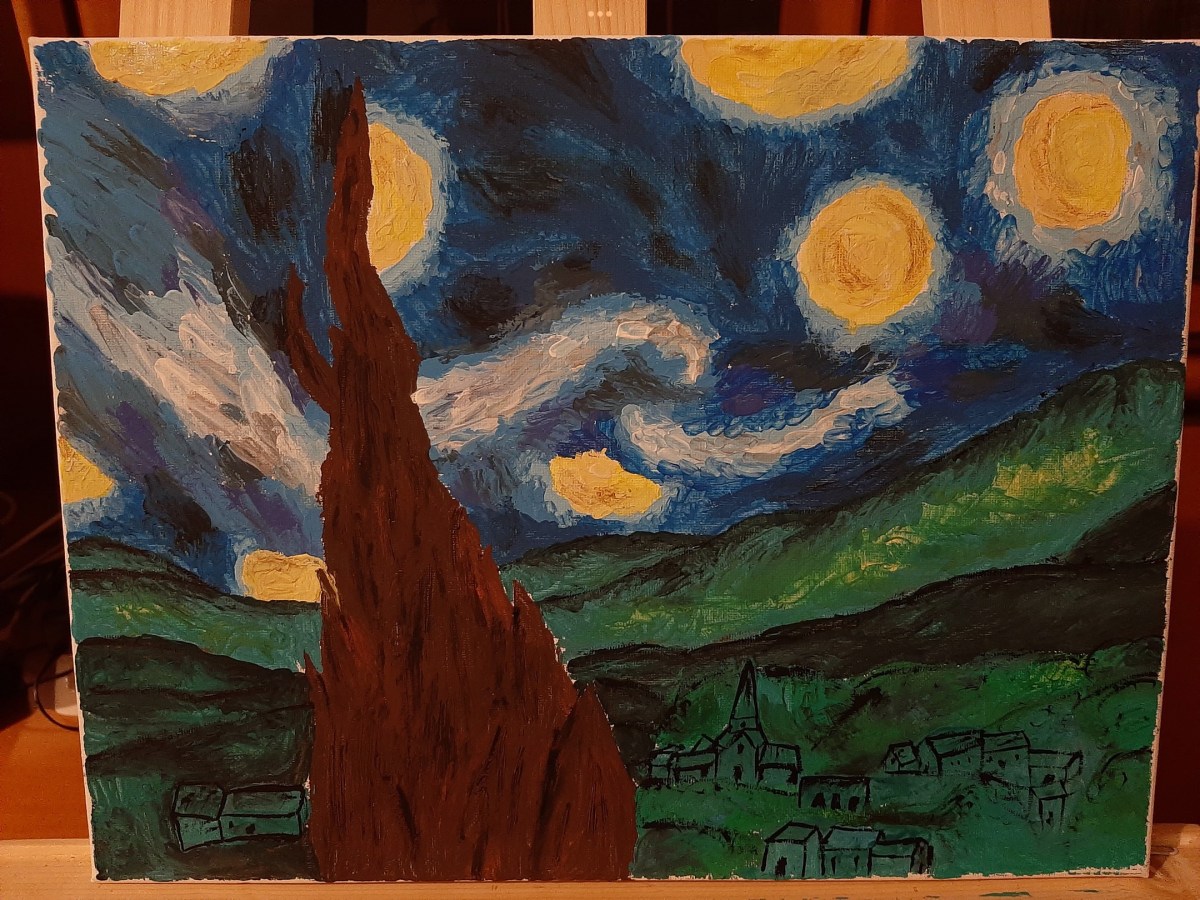“Ho scelto di portare questo dipinto che ho concluso pochi giorni fa. L’ho voluto portare sia perché sono abbastanza soddisfatta di com’è venuto, sia per l’interpretazione personale. Guardando il cielo mi viene in mente un posto sereno, senza regole, dove puoi essere chi vuoi, soprattutto te stesso; guardando invece la città, disegnata solo con il pennello rispetto al cielo, mi viene in mente un posto dove non puoi essere te stesso perché ci sono le persone che ti giudicano”.