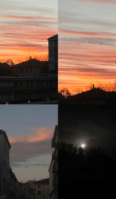 “Come gemma quest’anno ho deciso di portare qualcosa di diverso; tramonto e alba hanno sempre rappresentato qualcosa di importante e piacevole per me, ragione per la quale cerco sempre di immortalarle. Il cielo in tutte le sue forme e sfumature assume significati diversi ed è in grado di influire, spesso in modo positivo, sul mio stato d’animo. Con questi scatti, infatti, cerco sempre di racchiudere lo stato di calma, gioia o semplice stupore che ognuno di questi istanti mi ha portato per poterlo ricordare per sempre ripercorrendo questi momenti: ognuna delle numerose fotografie è unica e con un suo particolare significato. Nonostante queste siano solo semplici fotografie quindi rappresentano nella loro unicità un qualcosa di diverso e personale” (P. classe quinta).