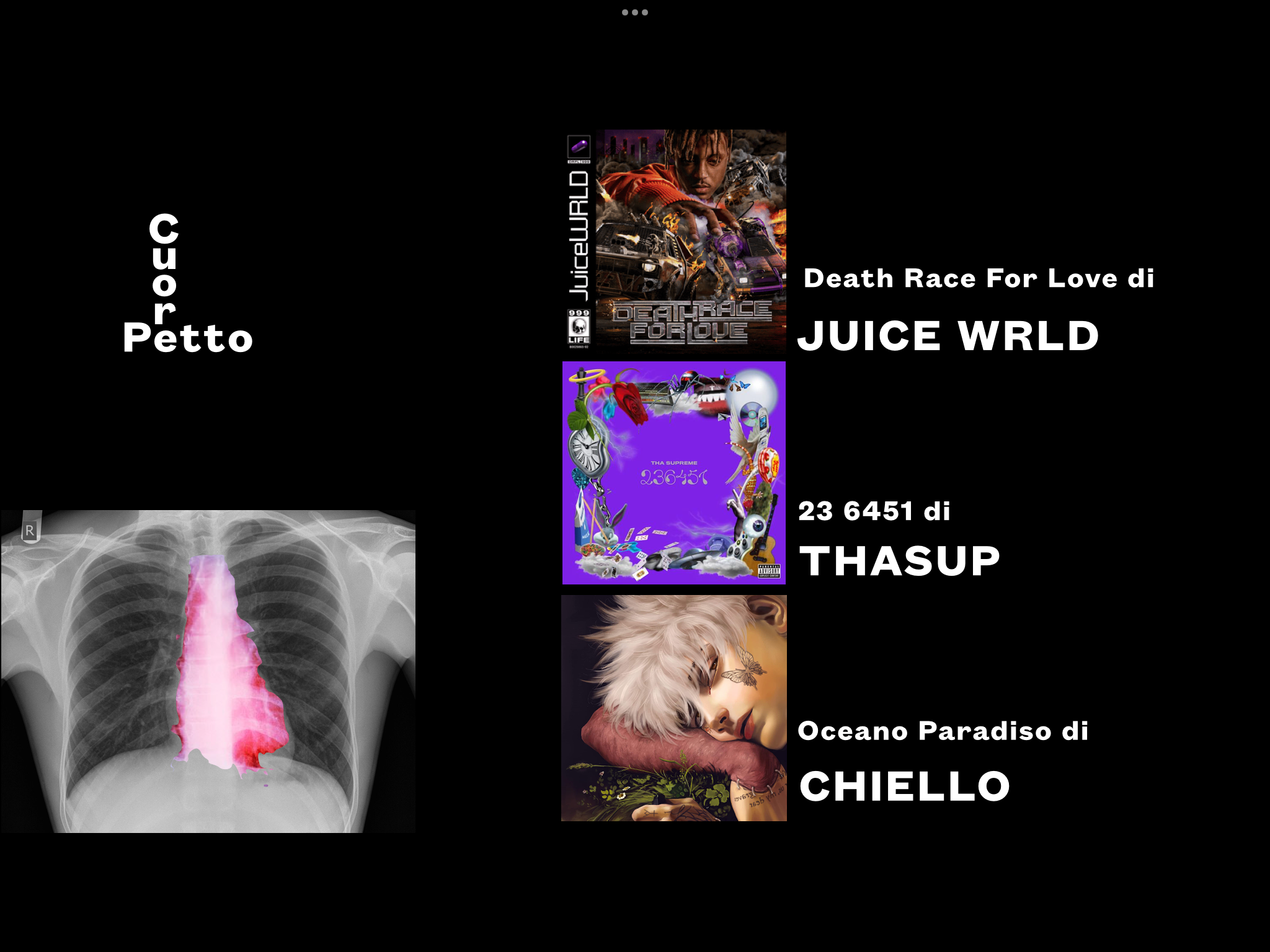 Petto/Cuore: il petto, cuore, amore, farfalle nello stomaco. Se quando sto male il cuore lo lascio da parte, quando mi prendo bene per una persona o qualcosa divento cieco e i prossimi album lo rappresentano parecchio. Il primo è sempre di Juice WRLD, Death Race For Love: in quest’album Juice dà il meglio di sé riguardo ai sentimenti, la cosa incredibile è che non ha mai scritto nulla, ogni album è un insieme di freestyle registrati a raffica come una mitragliatrice. Il secondo album è letteralmente un pezzo del mio cuore, 23 6451 (le basi) di Thasup, primo album di Davide, mi ricordo ancora le emozioni del primo ascolto, incredibili. Pensare che alla mia età lui faceva uscire quest’album e io sono qui a piangerci sopra fa ridere. Anche in quest’album possiamo trovare parecchi riferimenti ai sentimenti e al fatto di isolarsi quando si sta male. L’ultimo album riguardante il cuore è Oceano Paradiso di Chiello, artista che ho scoperto relativamente da poco grazie ad un mio amico del piano di sopra. Che dire, è struggente, la sua musica mi entra dalle orecchie ed esplode nel cuore, trasmette veramente tanto ed è solamente al primo album, non vedo l’ora di ascoltarne di nuovi (in aggiunta vorrei mettere due canzoni, Ribbon in the sky di Stevie Wonder e Where does your spirit go di Laroi. Una era la canzone preferita di mio zio e la ascolto se devo sfogarmi e piangere per ricordarlo, l’altra è in memoria di Juice e tendo a non ascoltarla per evitare di piangere).