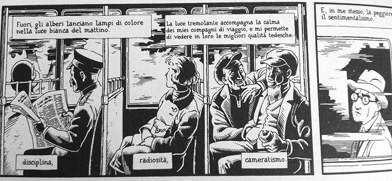 Approfitto per raccontare un piccolo episodio. Lunedì pomeriggio, in attesa che iniziasse il collegio docenti, stavo leggendo “Berlin. La città delle pietre” di Jason Lutes, un fumetto che racconta delle vicende storiche sulla Repubblica di Weimar. Non sono stati pochi i colleghi che, sbirciando immagini e nuvolette, appoggiandomi una mano sulla spalla, mi hanno detto: “Ah, ci diamo a qualcosa di facile, eh?”. Riporto qui sotto un passaggio (pag. 84) e una delle strisce che mi sono più piaciute, ambientata su un tram (pag, 74): “La storia dell’umanità è come un grande fiume, che trova il suo percorso nelle zone più basse del paesaggio, e ogni pagina è come una pietra. Viene lanciata senza scopo, solo per vedere il tonfo, però migliaia di pietre possono far salire il livello dell’acqua fino a far straripare il fiume. L’acqua si spande, la forza del fiume diminuisce, in breve diventa una palude. Ma se ogni pietra è posta attentamente e con un progetto, forse si può costruire qualcosa. Non per arginare la corrente, ma per deviarne il corso. Berlino è stata costruita su una palude. Spero ne resterà più di un mucchio di pietre”.