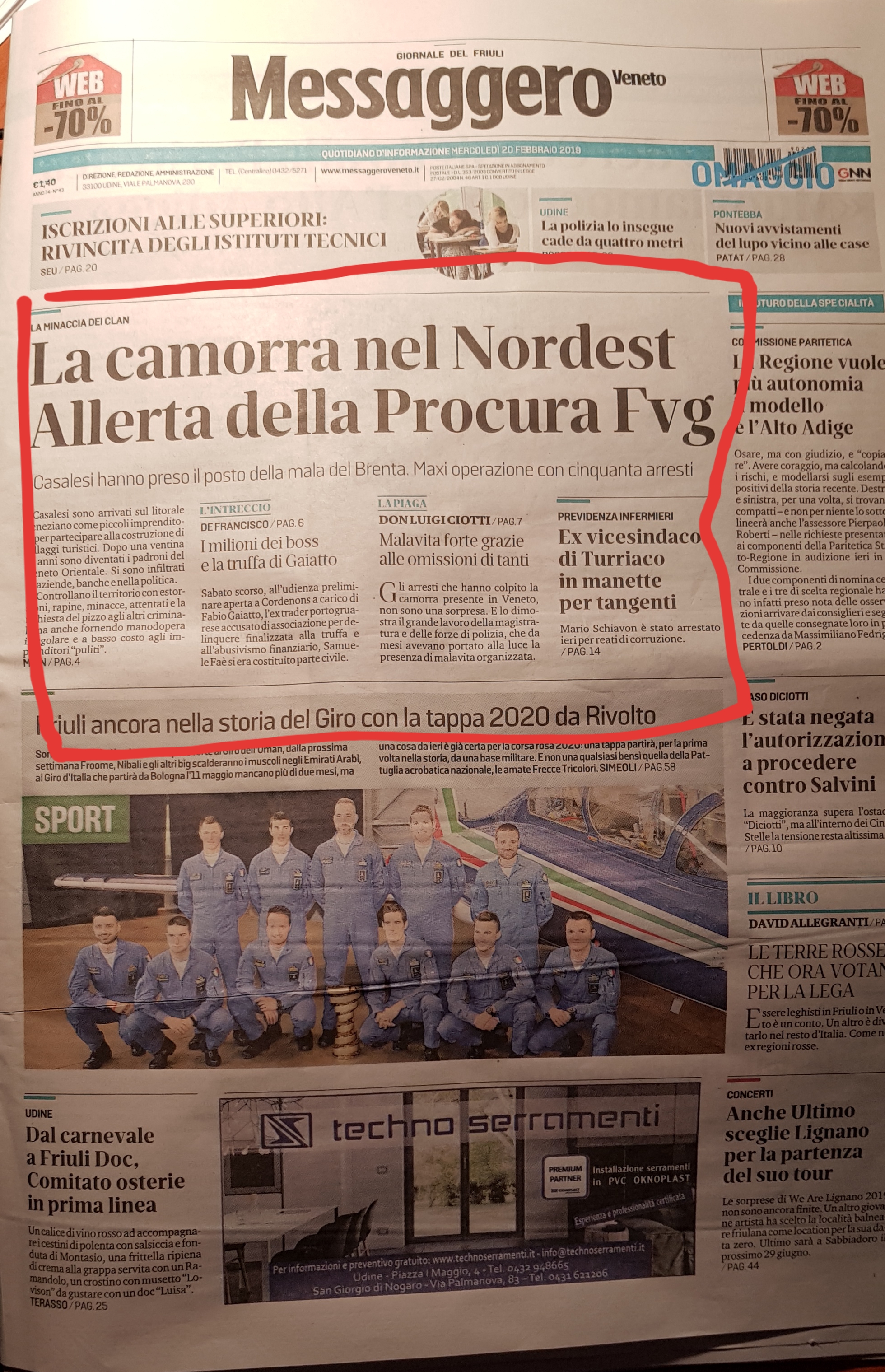 Questa mattina il quotidiano locale Messaggero Veneto ha dato molto rilievo al blitz svoltosi ieri in Veneto ai danni della camorra. La notizia è apparsa in prima pagina e all’interno del giornale sono state dedicate all’argomento 4 pagine. Mentre leggevo gli articoli, mi sono tornate alla mente le parole di Carlo Pieroni, Capocentro della Direzione Investigativa Antimafia di Padova, che a Trieste, sabato 2 febbraio, a Contromafie, così si esprimeva: “Quando intervengo in situazioni come queste, tutti si aspettano che il rappresentante delle Forze dell’Ordine parli della criminalità organizzata nel Triveneto andando dettagliatamente a raccontare quello che sta succedendo. Ma è una cosa che non si può fare. Parlerò però di come le mafie fanno infiltrazione”. Chissà se nella sua mente c’era tutto quello che sta succedendo in questi giorni…