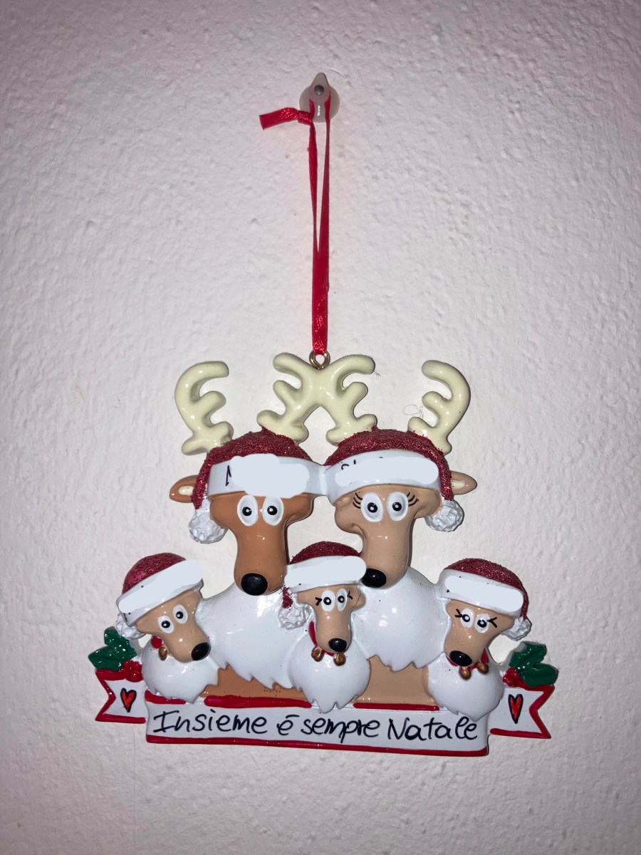 “Ho deciso di portare questa gemma perché l’ho trovata in realtà molto carina e anche divertente. Mia mamma per le vacanze di Natale ha deciso di comprare questo per appenderlo sulla parete della casa. lo all’inizio mi sono messa a ridere perché le renne con sopra i nostri nomi erano troppo simpatiche. Poi l’ho portata perché come dice la frase “insieme è sempre Natale” è quella che più ci rappresenta come famiglia, perché siamo molto uniti e ho un legame bellissimo sia con i miei genitori che con i miei fratelli. E sono molto grata di questo” (M. classe quarta).