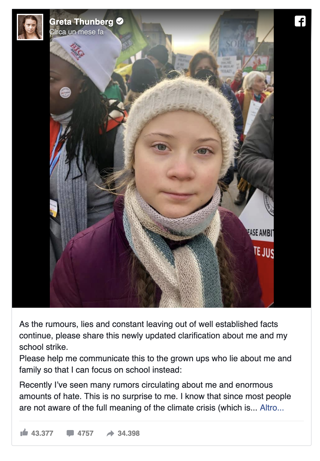 In un post su Facebook (qui tradotto in italiano da Fabio Alemagna), lo scorso 11 febbraio, Greta Thunberg è intervenuta per smentire i continui “pettegolezzi, bugie e costanti omissioni di fatti ormai assodati”. L’attivista svedese ha scritto di non far parte di alcuna organizzazione, di cooperare a volte con alcune ONG che lavorano sul clima e l’ambiente, continuando a essere indipendente e a rappresentare nessun altro che se stessa: “Faccio quel che faccio del tutto gratuitamente, e né io né qualcuno a me collegato abbiamo mai ricevuto alcuna somma di denaro o alcuna promessa di pagamento futuro in qualsiasi forma. E ovviamente tutto rimarrà così. Non ho incontrato un solo attivista per il clima che combatte in cambio di denaro, la sola idea è completamente assurda. Inoltre, viaggio esclusivamente col permesso della mia scuola e sono i miei genitori a pagare per i biglietti e gli alloggi”. Greta ha poi aggiunto di essere stata per breve tempo una consulente per i giovani nel consiglio di “We Do Not Have Time” ma di aver reciso ogni legame quando è venuta a conoscenza che un altro ramo dell’organizzazione aveva usato il suo nome. Per smentire tutte le voci sul suo conto, Greta ha voluto ricostruire alcuni passaggi che hanno portato ai suoi scioperi scolastici, partendo dagli inizi, nel maggio 2018, quando, dopo aver vinto una competizione di scrittura sul tema dell’ambiente tenuta da un quotidiano svedese, fu contattata da Bo Thorén della Fossil Free Dalsland, che aveva formato un gruppo con delle persone, in particolare dei giovani, che volevano attivarsi sulla crisi climatica. Durante gli incontri con altri attivisti nacque l’idea dello sciopero scolastico (“qualcosa che i bambini avrebbero potuto fare nei cortili delle scuole o nelle classi”), ispirata da quanto stavano facendo gli studenti di Parkland, in Florida, dopo la strage alla Marjory Stoneman Douglas High School. “L’idea di uno sciopero mi piacque, così la sviluppai e provai a coinvolgere altri giovani, ma nessuno era davvero interessato. Pensavano che una versione svedese della marcia del movimento Zero Hour potesse avere un impatto maggiore. Così mi diedi da fare da sola e non partecipai più agli incontri”, racconta Greta che ricorda come neanche i genitori approvassero la sua decisione di non andare a scuola per manifestare: “Il 20 agosto mi sedetti all’esterno del Parlamento svedese. Distribuii volantini con una lunga lista di fatti sulla crisi climatica e spiegazioni sul perché stessi scioperando. La prima cosa che feci fu quella di postare su Twitter e Instagram quel che stavo facendo, e presto diventò virale”.