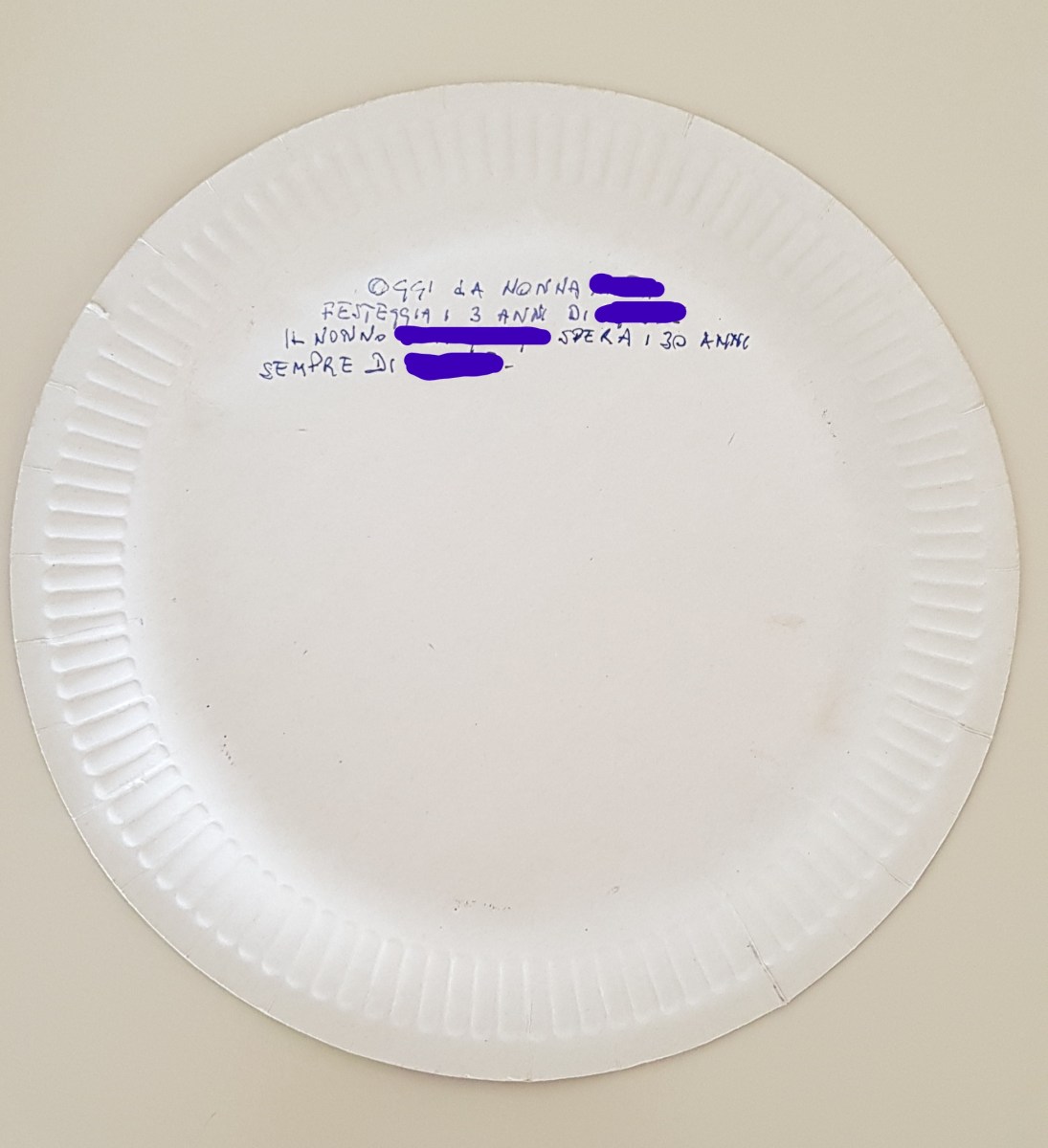 “Ho deciso di portare un piatto perché il mio terzo compleanno l’ho passato a Edimburgo con mamma, nonna e zii, mentre il nonno non è potuto venire e mi ha scritto questo piatto. Lo conservo ancora perché purtroppo lui non c’è più e rimane qualcosa di lui, che lui mi ha scritto”.