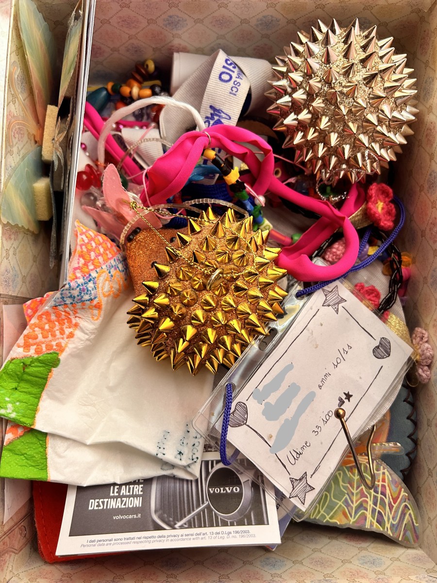 “Come gemma ho deciso di portare questa scatola. La riempio da quando sono molto piccola con oggetti significativi per me. Si possono vedere delle collanine, un fazzoletto, una “carta d’identità” e altre cose che non ricordo perché avessi buttato qua dentro. La cosa che mi piace di questa scatola è che niente di quello che c’è dentro viene rimosso. Anche se la mia vita continua a cambiare, questa scatola viene sempre e solo riempita e mai svuotata. Specialmente un taccuino di pelle mi fa ricordare i tempi della mia infanzia: regalatomi da una mia amica con cui ora non ho più contatti, continua ad essere un ricordo della nostra bella amicizia” (A. classe terza).